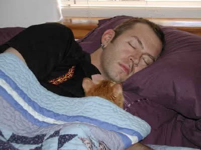 Around the end of the year, holiday time in 2004, I had to go on a business trip to Silicon Valley. It would take me thousands of miles away for a week or so—the longest I had ever been away from the boys since welcoming them into my life. Never having had pets of my own before, I was worried by the ridiculous notion that Boo and Bash would suddenly forget who I was after being away for an extended period of time, but my absence came and went somewhat uneventfully, their memories of me intact. I arrived back at the guesthouse a few hours after noon. Exhausted and sapped of energy from my travels, I collapsed upon the bed, still wearing the same “edgy” flames on black button-up shirt I put on before the sun began to rise earlier that morning. “Just a quick little power nap before dinnertime,” I thought. I awoke hours later. Until I heard the light clanging sounds of cooking utensils against mixing bowls and pans, I was unaware that Michaela had already arrived back home from her workday and was busy cooking dinner in the kitchen. Shifting slightly, I was just about to get up when I realized there was a weight perched upon my chest—it was Bash, staring at me intensely. Underneath the cozy, cat-warmed quilt, I stroked the fur on his back and scratched my way up towards his head and ears. Michaela heard my stirring, so she rushed into the bedroom, excitedly wanting to show me a picture she took on her digital camera. Apparently, Bash had been watching me for the duration of my nap, or at least as long as she had been at home. Out of context, the picture was quite humorous, like Bash was deviously calculating or pondering how he would dispose of all the piercings after gnawing my face off. Michaela submitted the photo to the now-defunct www.mycathatesyou.com, to which it was accepted as an example of cats despising their owners, but we all knew that the snarky caption added by the site couldn’t have been further from the truth.