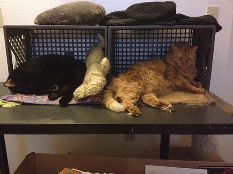 Shortly thereafter, Michaela and I would move in together. She ended up adopting the female from the litter and naming her Misty, so in total we had 5 cats in the decently sized guest house we were renting from a mutual acquaintance. Samantha was used to running the show in her previous living arrangement, so she was hell-bent on dictating the tone and the goings-on of her new territory as well. Boo gave her a very wide berth and mostly ignored her, but Bash tried to connect with her. Unfortunately, his futile attempts were met with hisses and swats, so he would retreat to my or Michaela’s general area after these encounters. We had two litter box areas in the guesthouse: one was in the back hall connected to the bedroom, and the other was in a tucked-away corner of the kitchen behind a cat-sized flap—underneath the cultured granite countertop and directly to the left of the two-tiered lazy Susan-style storage area. Both Michaela and I had noticed that Samantha would follow Bash to the “bathroom” and wait outside the flap so she could swat at him upon exiting or perhaps deviously trap him there in perpetuity. As soon as either of us witnessed this antagonistic behavior, we would shoo her away, gently coax Bash out of the enclosure, and assure him that he was safe from one of our two feline witches.