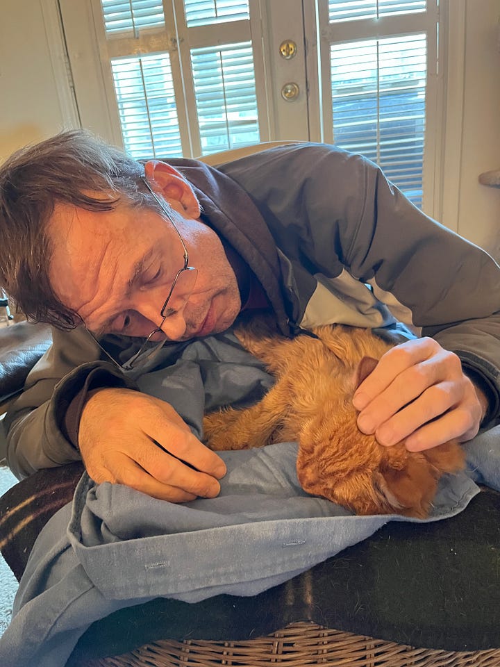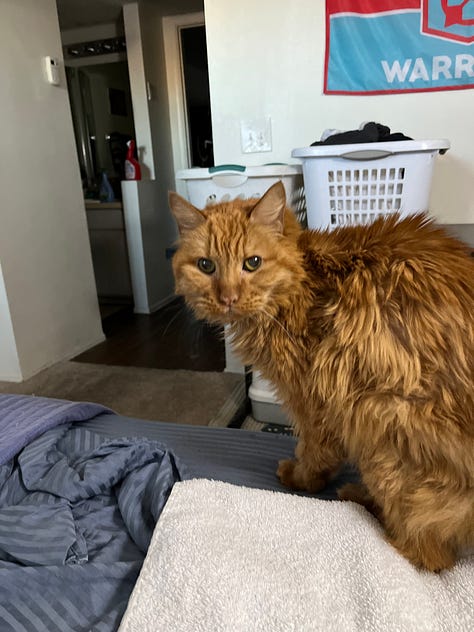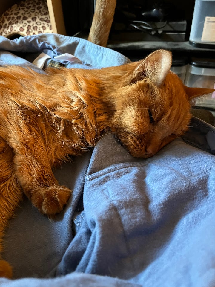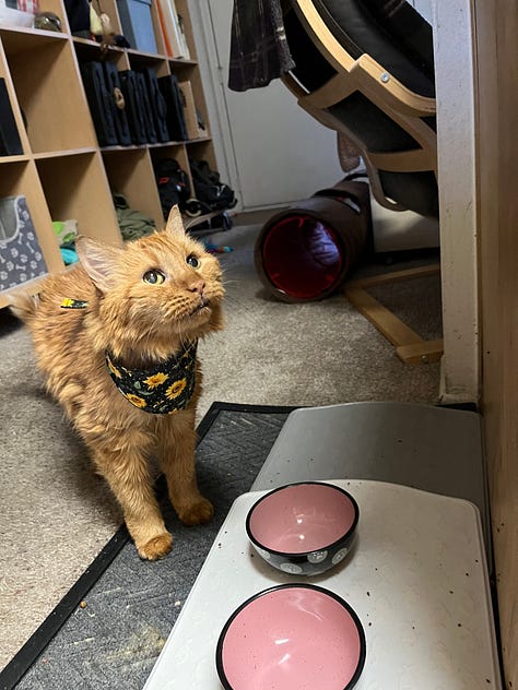 I awoke hungry, so I went to the kitchen and threw a couple of frozen dinners in the microwave. I solemnly prepared a single bowl of soft cat food, placed it on the food mat, and then retreated to the living area to wait for my meal to be ready for consumption. Sitting there, I was suddenly overcome with a wave of sadness—missing Bash’s presence in an instant. The crying commenced, and Mango did his best to comfort me by sitting on my lap and purring as if to say, “I’m still here for you, buddy.” Minutes passed, the tears stopped flowing, and I turned on my television and PS5 and started to play—then came the realization and chortling.